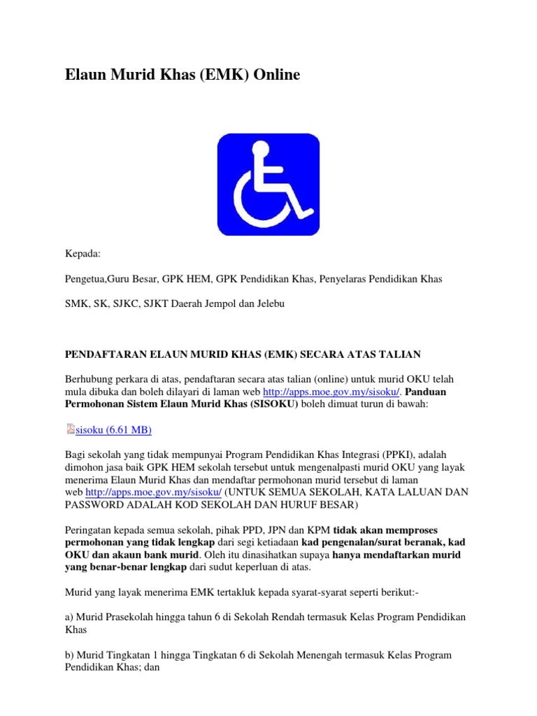 Garis Panduan Ppi Mbk Edisi 2018 Flip Ebook Pages 1 50 Anyflip Anyflip from online.anyflip.com Manual pengguna apb emk download. I.membenarkan pihak kolej /sekolah menyimpan buku akaun untuk pembayaran emk anak. Permohonan elaun murid khas (emk) melalui sistem elaun murid berkeperluan khas (sisoku) tahun 2013. Elaun khas rm200 itu disyorkan oleh bekas menteri kesejahteraan bandar, perumahan dan kerajaan tempatan, tan sri noh omar pada 21 mac lalu bagi mengiktiraf usaha dan kerja bomba dan penyelamat menangani bencana yang meletakkan agensi itu setanding agensi penguatkuasaan lain. Elaun untuk bekas agong dan bekas permaisuri agong. Selain itu, kebajikan murid berkeperluan khas di sekolah turut diberi perhatian oleh kerajaan. Mereka yang sedang mengikuti pismp akan terus menerima rm430 sebulan untuk elaun sara hidup dan elaun perjalanan tidak lebih rm500 setahun sehingga mereka tamat pengajian. Semua ibubapa yang mempunyai anak yang belajar dari prasekolah sehingga matrikulasi kementerian pendidikan malaysia yang mempunyai kad oku layak memohon.