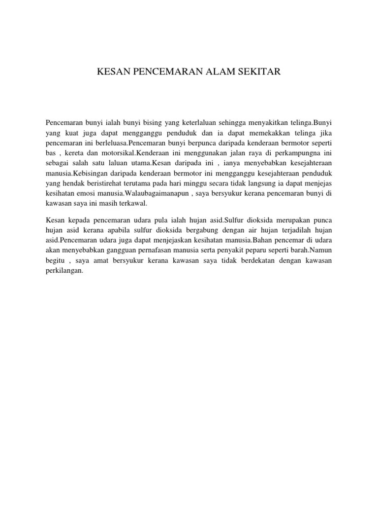 Terganggu habitat dan alam sekitar turunkan nilai ph tanah tanah tidak subur ganggu jaringan makanan musnah organisma kurangkan kadar fotosintesis tumbuhanpanitia sains kvkk 2013. Kesan terhadap pencemaran alam sekitar sudah pun disebarkan melalui media massa namun manusia durjana yang tidak mencintai alam memandang enteng terhadap permasalahan pencemaran alam sekitar. Akibat daripada pencemaran alam sekitar, kesihatan manusia turut terjejas. Peraturan kualiti alam sekitar (udara bersih,1978) di bawah peraturan ini, jarak industri dengan kawasan kediaman di hadkan kepada 1000 meter. Contoh karangan punca pencemaran alam sekitar. Buktinya, para pengkaji menjumpai kesan terbakar di dinding gua tempat manusia tinggal pada zaman dahulu. Pencemaran udara mengikut laporan yang dibuat oleh jabatan alam sekitar,melalui akhbar selain pertandingan yang telah disebutkan, pertandingan menulis karangan dan sajak juga dapat memberikan kesedaran kepada orang ramai. Izharlah bahawa penggunaan pengangkutan alaf baru dapat mengurangkan pencemaran alam sekitar dan melestarikan kebersihan udara. Pengalaman di beberapa negara seperti china menunjukkan bahawa elemen ree terbukti memberi kesan besar kepada alam sekitar. 6 kesan pencemaran udara kerosakkan tumbuhan kekurangan sumber makanan dan ekonomi menjejaskan kesihatan manusia kenaikan suhu bumi menyebabkan jerebu. Di negara kita misalnya penggunaan kereta masa kini telah bertambah dengan begitu pesat mencari alternatif selain daripada minyak juga adalah penting bagi tujuan mengurangkan kesan pencemaran alam sekitar. Kesan pencemaran alam sekitar terhadap dunia hari ini. Pencemaran alam sekitar sangat mendatangkan masalah kepada rakyat.jadi kita perlulah bekerjasama untuk menangani masalah ini.pihak kerajaan perlu melakukan kempen bagi memberi.