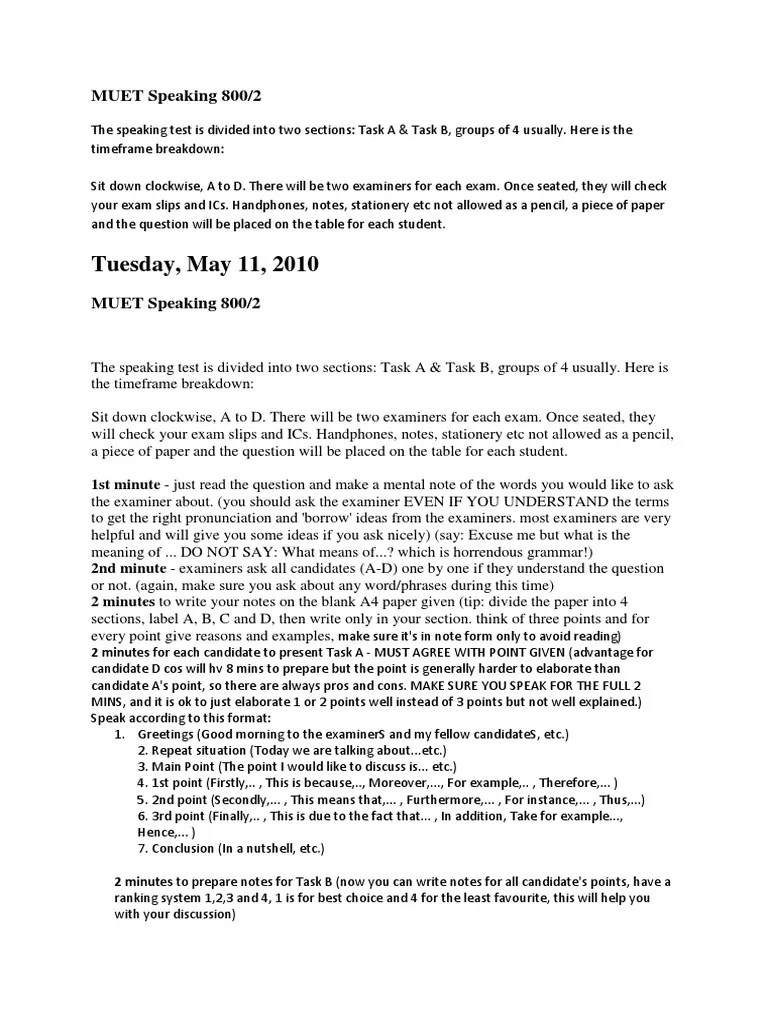 Sample Essay For Muet Speaking Test Internetupdater Web Fc2 Com from image.slidesharecdn.com ask the examiner to explain the given situation or the meaning of any words that you are. Individual presentation ~study the stimulus or topic given. In part one there are two phases. The aim of the campaign was to generate awareness & support for asean unity, through a variety of activities. Muet past year question papers (malaysian university english test) untuk lulus cemerlang. One possible reason is a hectic lifestyle. Who has the greatest influence on a person's character? Let's face it, nobody looks forward to ielts speaking part 3!