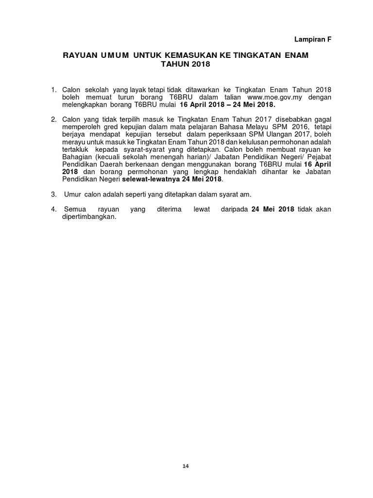 Tempoh rayuan kemasukan tingkatan 6 tahun 2018: 0⃣1⃣ borang t6bru ini adalah untuk calon yang membuat rayuan ke tingkatan 6 kecuali program pendidikan khas integrasi (ppki) dan sekolah menengah pendidikan khas (smpk). Bagi tahun 2021, rayuan hanya boleh dibuat secara online di pautan berikut 1. Jadi, macam mana cara nak merayu ke tingkatan 6? Borang t6bru ini adalah untuk murid membuat rayuan memasuki tingkatan enam tahun 2018 kecuali sekolah menengah pendidikan khas (smpk) dan.