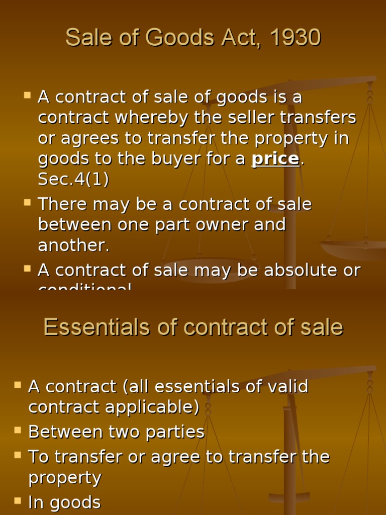 Lecture 2 Sale of Goods Act 1930 #CA Foundation law - YouTube from i.ytimg.com B) implied warranty that buyer shall have quiet possession of the goods. The sale of goods act is complimentary to contract act. Law of sale of goods definition : (2) in relation to contracts made on certain dates, this act applies subject to the modification of certain of its sections as mentioned in schedule 1 below. F the law applicable • the governing statute as to peninsular malaysia is the sales of goods act 1957 which was modeled after the english soga 1893 almost in its entirety. D) implied condition that in a sale of goods by description, the goods must correspond with the description. A contract of sale is made by an offer to buy and sell goods at a price and by the acceptance of such an offer: Sales of good act 1957 has provision to protect buyers of goods.